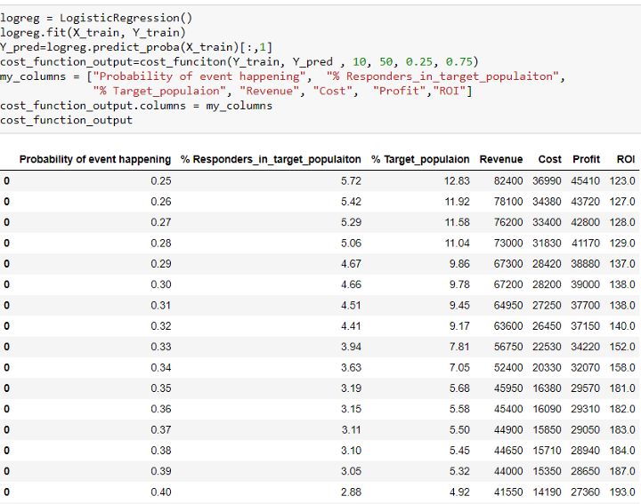 3. 对训练集进行Logistic回归,并使用事件发生的预测概率、以0.01的间隔来计算每个概率值的成本,收入,利润和投资回报(ROI)。