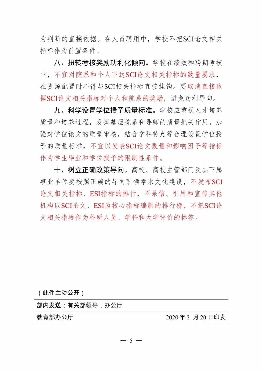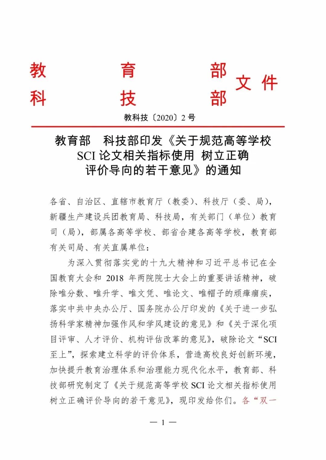 教育部、科技部近日印发《关于规范高等学校SCI论文相关指标使用 树立正确评价导向的若干意见》,提出规范各类评价中SCI论文相关指标的使用,要求取消直接依据SCI论文相关指标对个人和院系的奖励,不得将SCI论文作为人员聘用的前置条件,不宜以发表SCI论文数量和影响因子等指标作为学生毕业和学位授予的限制性条件。