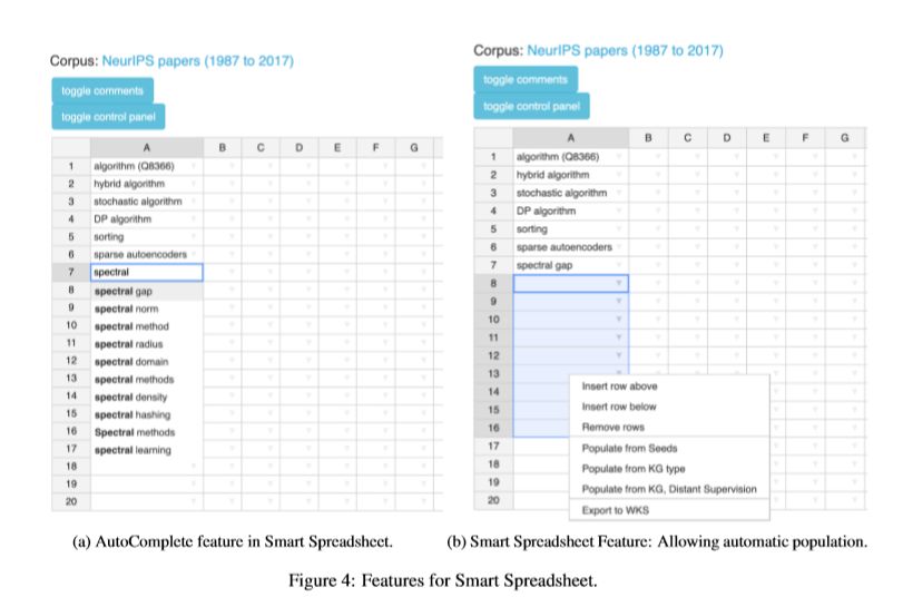 图4b显示了KGIS系统的一张截图,在此示例中,用户输入一些算法名称作为实例,改组的类型名为“algorithm”,选择一些单元格并单击右键以填充单元格。另外,SSS提供了自动完成功能。例如,在图4a中,只要用户输入频谱术语,系统就会根据输入语料库自动完成填充任务。