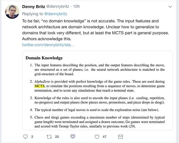 著名科技博客wildml.com博主,同时也是前谷歌大脑成员Denny Britz却对此保持谨慎态度。他表示:准确来说,没有“先验知识”并不完全准确。新算法中输入的特征以及网络的结构的建立都是需要领域知识的。并不清楚AlphaZero是怎么泛化到看起来完全不同的领域的,但是其中MCTS确实是一种基于泛化目的的设计,作者本人也承认这一点。