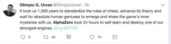 Olimpiu G. Urcan表示:人类用了1500年建立起来的智慧结晶,AlphaZero只用了24小时就给打破了