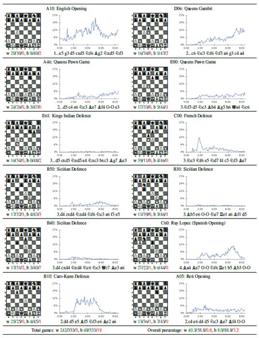 表2:分析12个最受欢迎的人类开局(在线数据库(1)中播放超过10万次)。每个开局都标有其ECO代码和通用名称。该图显示了AlphaZero每次开局自我对弈比赛和训练时间的比例。我们还从AlphaZero的角度报告了从每场比赛开局的100场比赛AlphaZero vs. Breakish比赛的胜负/平局/失败结果,无论是白色(W)还是黑色(B)。最后,从每个开局提供AlphaZero的主要变化(PV)