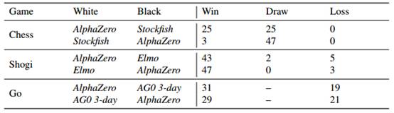 表1:国际象棋,将棋和围棋比赛中AlphaZero的评估,经过三天的训练,与Stockfish,Elmo和之前发布的AlphaGo Zero进行100场比赛,表中显示的是以AlphaZero视角的结果结果。
