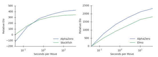 图2:用Elo评估AlphaZero每步的思考时间的可扩展性。(a)展示了在国际象棋中AlphaZero和Stockfish的表现,每一步的思考时间。(b)展示了在将棋中AlphaZero和Elmo的表现,每一步的思考时间。