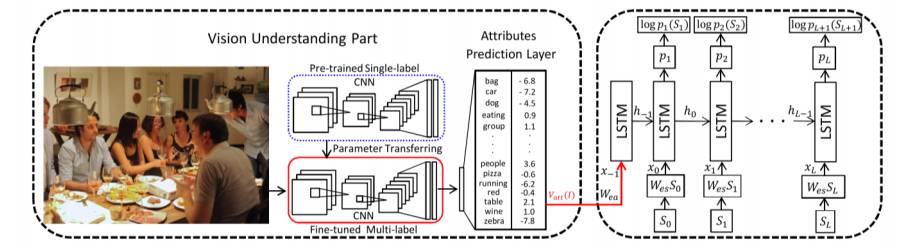 使用上一步生成的属性作为输入,用一个LSTM网络,最大化给定图片的正确描述的概率,训练得到语义标注的模型,结构图如下所示。