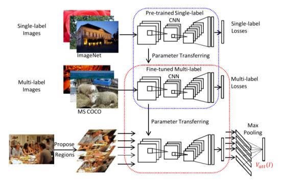 图像属性的训练过程:可以由下面的结构图表示,它是一个VGGNet结构的CNN网络,先在ImageNet上预训练,得到单标签下的参数初值。然后,在MSCOCO数据集上,做一个多标签分类,分类数为属性集的大小,训练得到优化后的参数。在得到测试图像的属性时,先将测试图像分为不同的部分,然后经过得到该图片的属性。