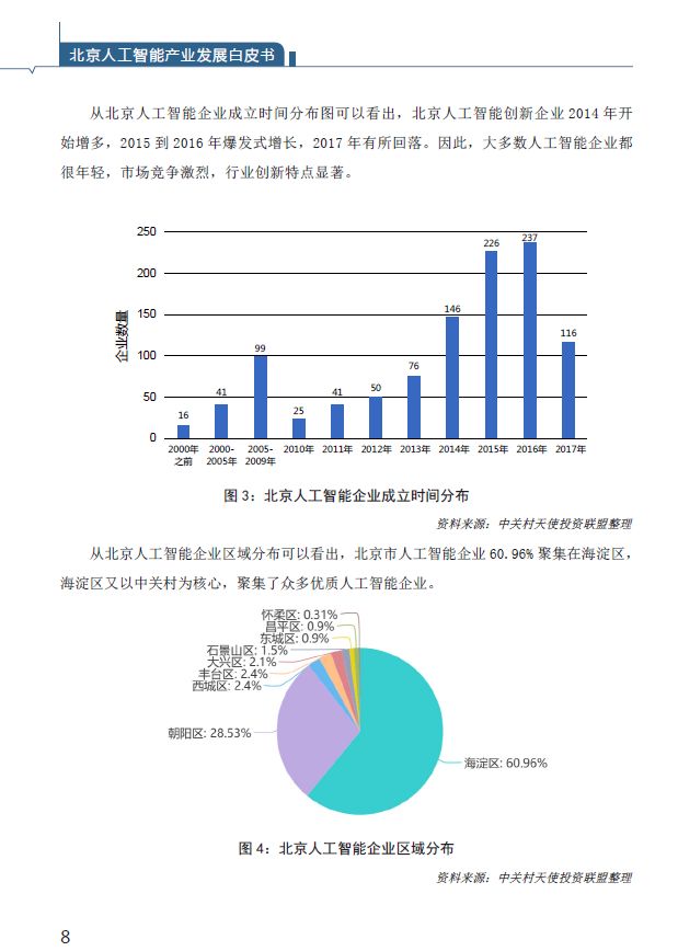 《白皮书》首次摸清了北京人工智能产业底数。综合清科、WIND、IT桔子、蓝海巨浪等公开数据及投资机构定向采集数据,由课题组整理,截至2018年5月8日,全国人工智能企业4040家,北京市人工智能企业1070家,占比26% ;全国拿过风险投资的人工智能公司合计1237家,北京市拿过风险投资的人工智能企业431家,占比35%。从融资阶段看,北京人工智能企业一半以上仍处于初创期,在A轮之前的企业占比达56.97%,具有创新发展潜力。从企业成立时间看,北京人工智能企业2015-2016年呈现出爆发性增长,人工智能快速增长特征明显。从区域看,60.96%的人工智能企业注册在海淀区。中关村成为我国人工智能创新高地。