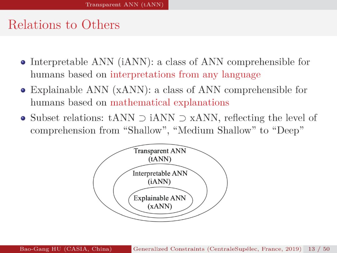 针对目前英文“Interpretable”与“Explainable”对应中文都是“可解释性”,文献中也出现混用情况,我建议将iANN与xANN分别称为“语义可解释神经元网络”与“数学可解释神经元网络”。它们分别对应了“可理解性”中本质上的不同程度。该说法也可以推广到人工智能方法上。这里也可以先想想它们与“透明度”的关联?