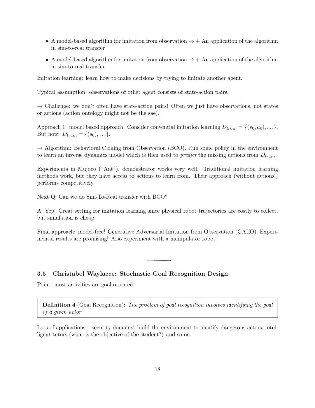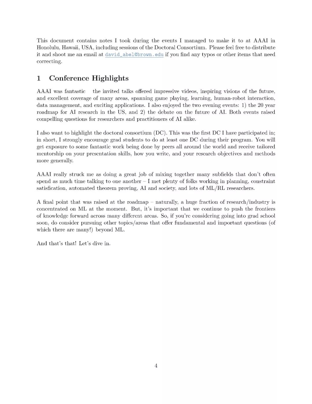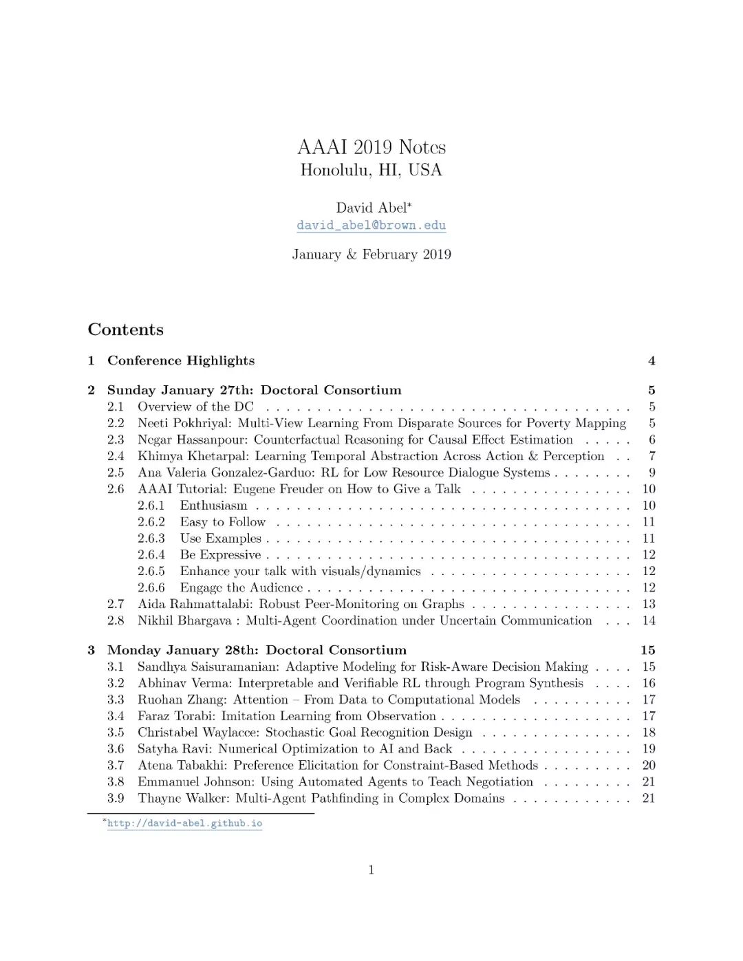 今天,美国布朗大学的一位同学 David Abel,公开分享了他在这次大会上整理的长达77页的会议笔记。这份笔记内容详实,包含了不少来自现场拍摄的PPT图片,还根据参会日期和会场做了详细的目录。 今年重点关注的内容包括机器学习、视觉和NLP、博弈论、启发式搜索和认知系统。