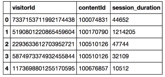 对于协同过滤,我们不需要知道任何关于用户或内容的属性。本质上,我们需要知道的是特定用户给出的特定项的userID、itemID和打分(ratings)。在这种情况下,我们可以使用在页面上花费的时间作为打分的代表。Google Analytics 360将网络流量信息导出到BigQuery,我是从BigQuery提取数据的: