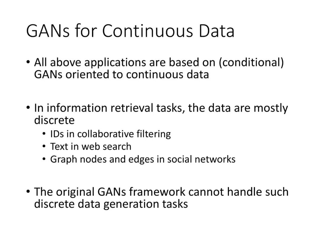 【导读】生成对抗网络(GAN)已经在深度学习和无监督学习中有广泛的应用。利用对抗训练机制,GAN的生成模型生成以适应潜在的未知实际数据分布,判别模型估计数据实例是真实的还是生成的。最初提出这样的框架用于拟合图像的连续数据分布,因此直接应用于数据大部分是离散的信息检索场景(例如ID,文本和图形)并不简单。