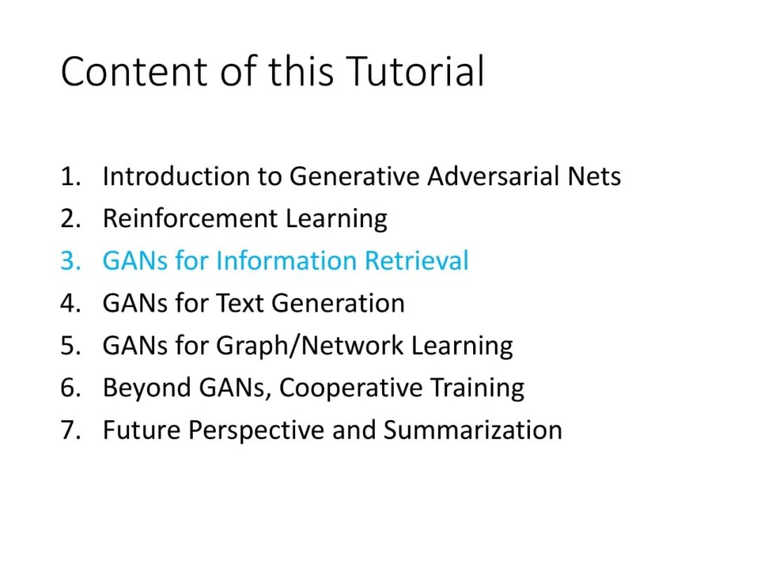 在本教程中,作者将重点讨论GAN技术以及各种信息检索场景中离散数据拟合的变体。 (i)介绍了GAN框架的基本原理及其理论属性; (ii)仔细研究了将GAN扩展到离散数据生成的有希望的解决方案; (iii)介绍了IRGAN,它是适合单一ID数据分发的基本GAN框架,也是信息检索的直接应用; (iv)我们进一步讨论顺序离散数据生成任务的任务,例如文本生成,以及相应的GAN解决方案; (v)介绍了最近关于图形/网络数据与GAN节点嵌入技术拟合的工作。同时,我们还介绍了相关的开源平台,如IRGAN和Texygen,以帮助受众进行GAN信息检索的研究实验。最后,对本教程进行了总结,并对GAN在信息检索方面的进一步研究方向展望。