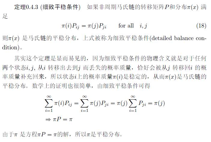 Metropolis sampler一个关键的要求是:建议分布是必须对称的,即:。因此,基于旧状态到新状态的建议概率,与从新状态返回到旧状态的建议概率是相同的,这样才能满足平稳细致方程(具体细节见:LDA数学八卦, 这里面有非常清晰说明平稳细致方程的含义,下图有个定义)。对称的建议分布有如下:正态分布(Normal),柯西分布(Cauchy),学生t分布(Student-t),以及均匀分布(uniform distributions)。如果建议分布不具有对称性,应该使用Metropolis-Hastings sampler,将在下一节讨论。