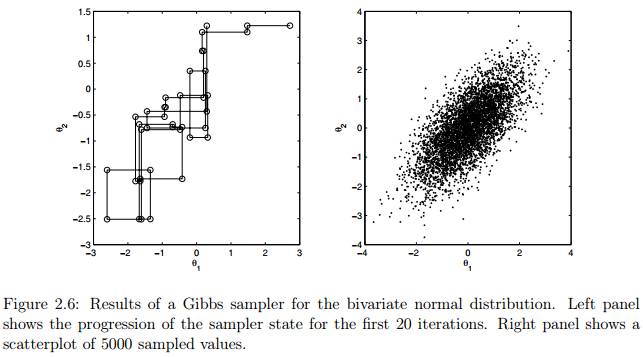 图2.6展示了利用Gibbs sampling二元正态分布的模拟结果,其中和。采样器共在一条链进行5000次迭代。右图展示了所有样本的散点图,左图模拟了前20次迭代的状态的进展。