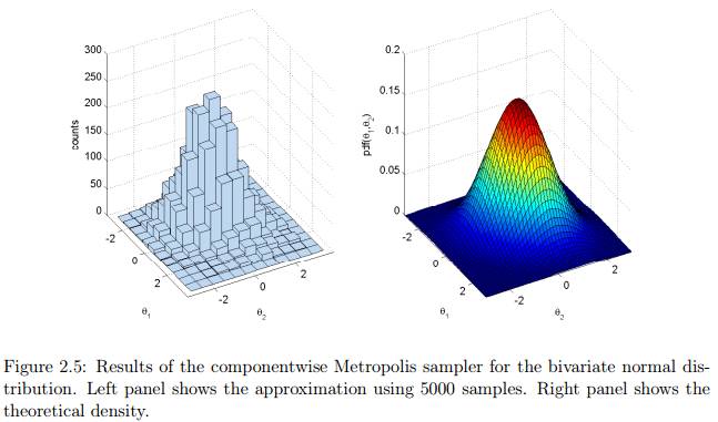 ,利用componentwise Metropolis sampler采样方法。建议分布的每个子变量是以原始值为中心的,标准偏差为σ。该采样器的MATLAB实现代码如Listing 2.7所示,代码的输出结果如图2.5所示。