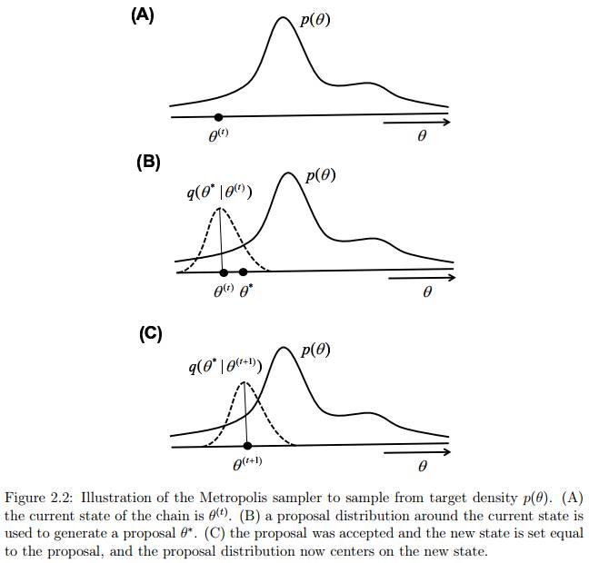 图2.2说明了两个状态序列转移的过程。为了直观地了解该过程为什么能从目标分布中获得样本,注意,如果新的建议分布得到的新状态的建议值相比旧节点状态更有可能在目标分布之下,公式(2.6)将始终接受新的建议。因此,采样器将移动到状态空间中,目标函数密度更高区域。然而,如果新的建议没有当前的状态好,仍然有可能接受这个“更糟糕”的建议并且转移到该建议状态。该过程总是接受“好的”建议,并且偶尔接受“坏的”建议,以确保采样器能探索整个状态空间,并且确保采样的样本从分布的所有部分获得(包含尾部)。