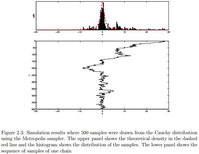 我们使用正态分布作为建议分布,即从Normal(θ(t),σ)分布中产生建议。因此该分布的均值集中在当前状态,参数σ表示标准差需要人为设定,以控制建议分布的可变性。Listing 2.1展示了MATLAB函数,该函数返回非标准的柯西分布的密度。Listing 2.2展示了MATLAB代码实现的Metropolis sampler工具。图2.3展示了单个链经过500次迭代的模拟结果。其中,图2.3的第一个图展示了虚红线的理论密度,直方图展示了500个样本的分布。第二个图展示了样本的一个链。代码很简单,大家可以看看,不懂的可以在评论下方一起讨论。