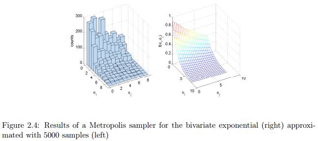 ,所以这一项在接受概率中消失了。上述这种采样器的MATLAB实现在Listing 2.4中。在Listing 2.4中左图是利用5000个样本模拟的近似分布。