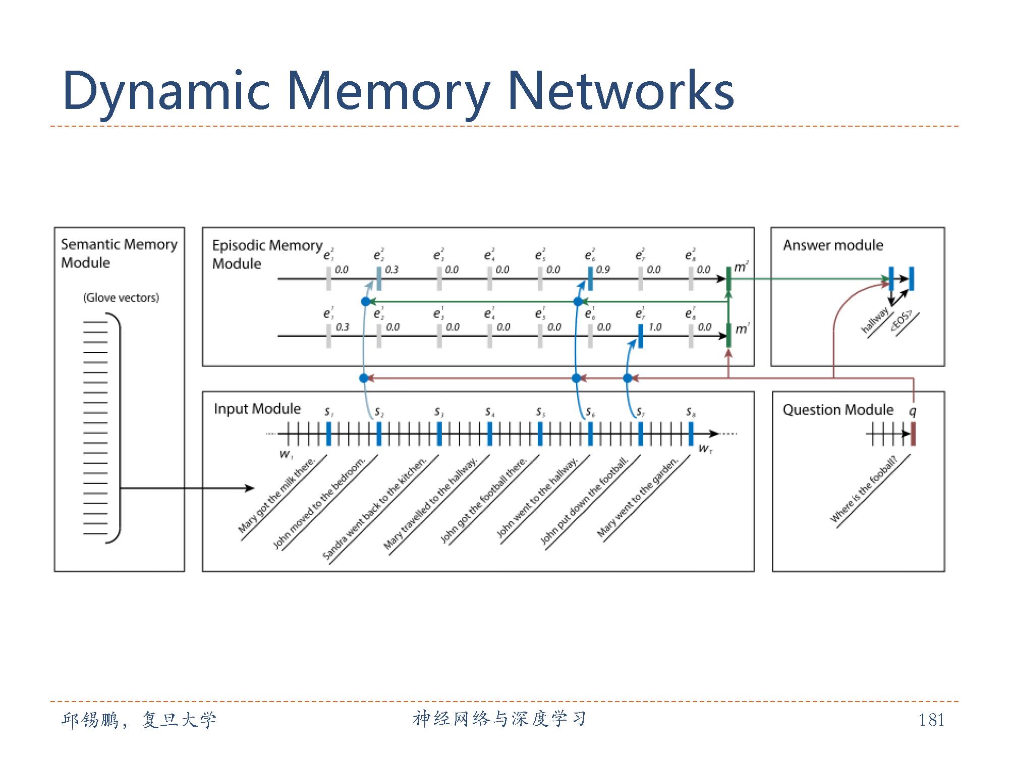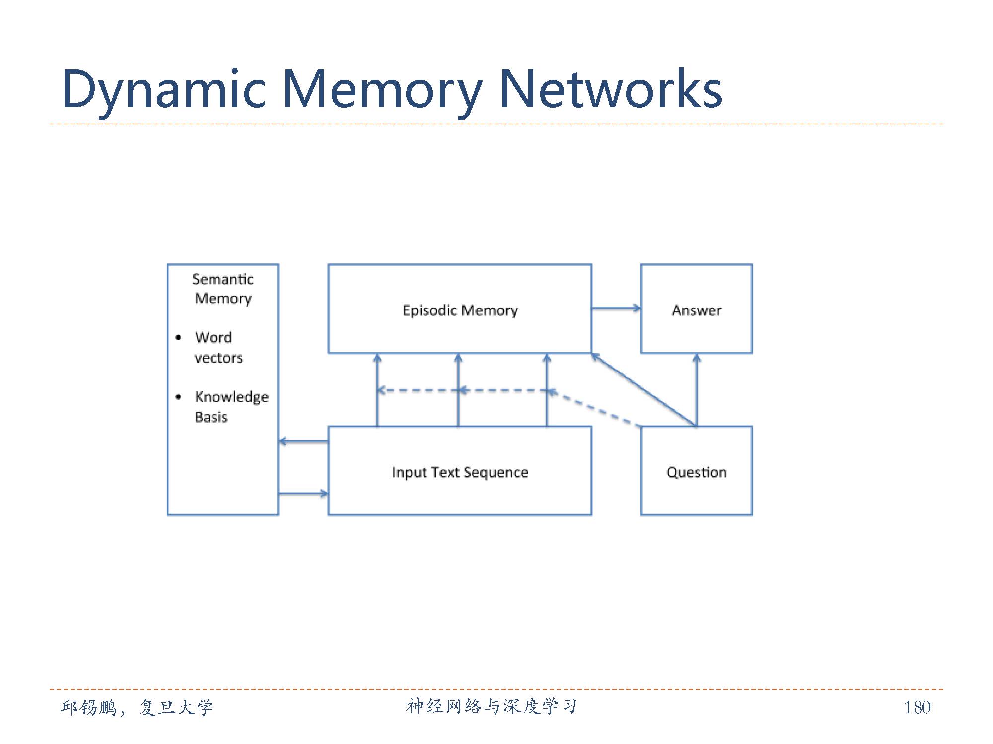 动态记忆网络[Kumar et al., 2015]也是引入了外部记忆的模型。主要包括输入模块,问题模块片段记忆模块,回答模块。动态记忆网络可进行端到端的训练,并在多种任务上取得了 state-of-the-art 的效果包括 QA(Facebook 的 bAbI 数据集),情感分析文本分类(Stanford Sentiment Treebank)和词性标注(WSJ-PTB).