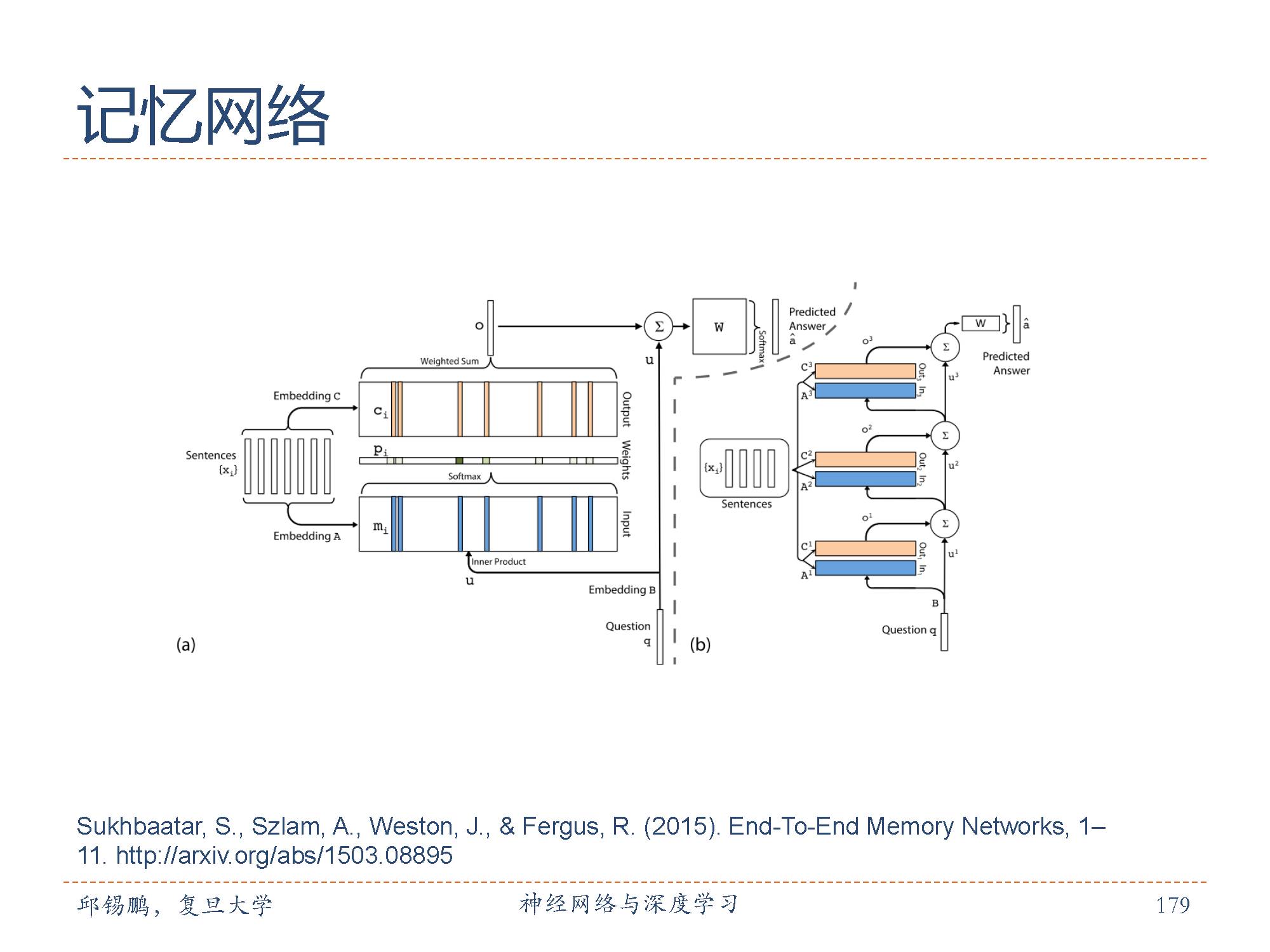 端到端记忆网络(End-To-EndMemory Network, MemN2N) [Sukhbaataret al., 2015]采用一种循环网络的结构,可以多次从外部记忆中读取信息,是一种只读的外部记忆。