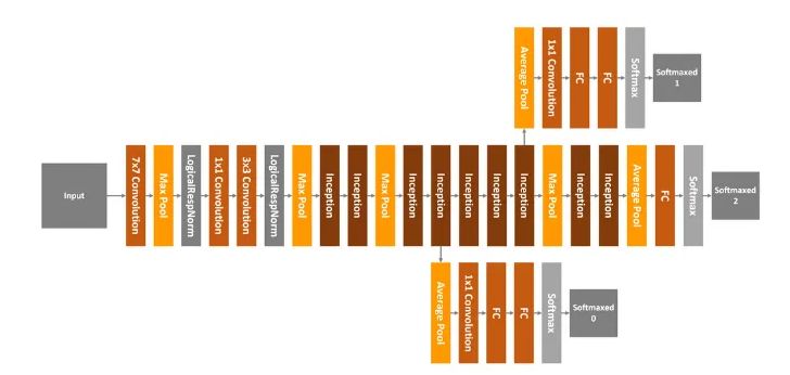 如您所见,1×1卷积层,3×3卷积层,5×5卷积层和3×3最大池化层一起执行它们的操作,然后将它们的结果再次在输出时堆叠在一起。GoogLeNet总共有22层,看起来像这样: