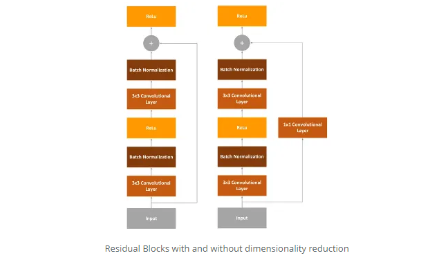 剩余网络或ResNet是我们在本文中将要使用的最终体系框架。以前的框架存在的问题是它们很深。它们有很多层,因此很难训练(逐渐消失的梯度)。因此,ResNet通过所谓的“身份快捷方式连接”或剩余块解决了该问题: