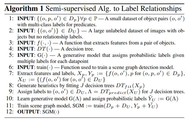 对于关系(例如carry),我们使用与图像无关的特征自动创建启发式,然后使用生成模型将概率标签分配给一大组未标记的图像。然后可以使用这些标签来训练任何场景图预测模型。