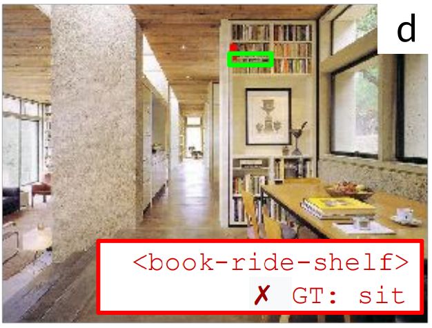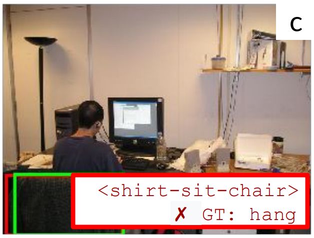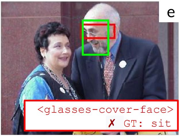 鉴于我们没有使用图像特征,我们生成了一个合理的标签<glass-cover-face>,但是,我们的模型不正确,因为两个典型的不同谓词(sit和cover)在上下文<glasses- ? -face>中共享一个语义。