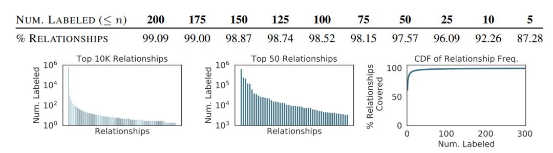 视觉关系有一个长尾的关系(左图),不经常出现。目前的模型只关注Visual Genome数据集中的前50种关系(中间图),它们都有数千个标签实例。其实这会忽略98%以上的关系,比如很少有标签的实例(右图,顶部表)。