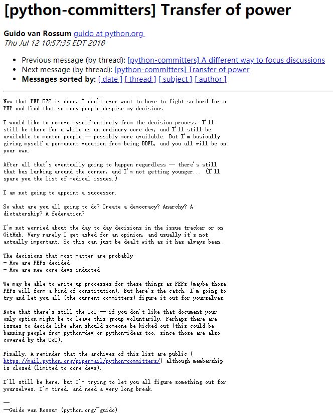 过去一段时间,Guido一直在为PEP572的通过而努力,然而此过程并不顺利,出现了大量的反对声音,Guido对此也是精疲力竭。Guido表示不会任命继任者,Python 的未来从此将由 Python 的核心开发者来决定。他目前只担心两个问题:1、PEP如何决定,2、如何引入新的核心开发者。并提醒现在的核心开发者,CoC(Python社区行为准则)仍然存在。
