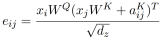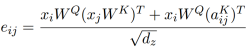 输入元素xi,xj之间的边由a_ij^V 和a_ij^K 表示,学习两种不同的边缘表示的动机是a_ij^V 和a_ij^K分别适合方程3和4使用。不需要额外的线性变换。这些表示可以在attention head之间共享。