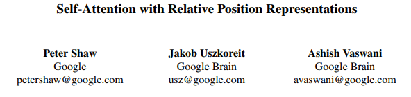 Vaswani等人在2017年介绍了一个完全依靠注意力机制的序列表示方法——Transformer,取得目前最好的机器翻译成绩。与递归神经网络和卷积神经网络相比,它没有在网络结构中显示地建模相对或绝对位置信息。相反,它需要在输入中添加绝对位置的表示。在这项工作中作者提出了另一种方法,将自注意力机制扩展到有效地考虑相对位置的表示,或序列元素之间的距离。在WMT2014从英语到德语和从英语到法语的翻译任务中,本文方法相比绝对位置表示分别提高了1.3 BLEU 和0.3 BLEU。值得注意的是,作者观察到将相对位置和绝对位置表示结合在一起,并不会进一步改进翻译质量。作者描述了本文方法的一个有效实现,并将其转换为一个关系感知的自注意力机制(relation-aware self-attention mechanisms)的实例,该机制可以推广到任意图形标记输入(graph labeled inputs)。