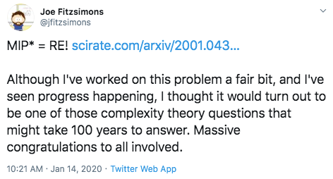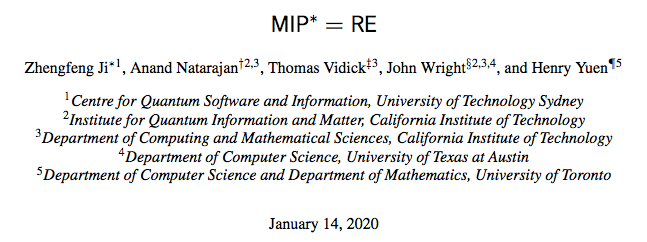 研究小组的165页论文发表在arXiv上,但尚未经过同行评审。如果证明成立的话,它可以一举解决纯数学、量子力学以及计算机科学分支一个被称为“复杂性理论”(complexity theory)的许多相关问题。