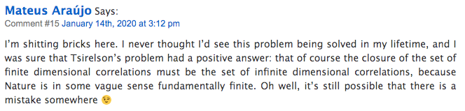 这个证明令许多社会人士感到惊讶。“我确信Tsirelson的问题得到了答案,”Araújo在评论中补充说,这一结果动摇了他的基本信念,即“在某种模糊的意义上,自然在本质上是有限(finite)的。”