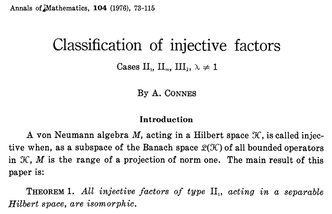 在1976年的论文“Classification of Injective Factors Cases II1, II∞, IIIλ, λ ≠ 1”中,使用运算符的语言,Connes提出一个问题: