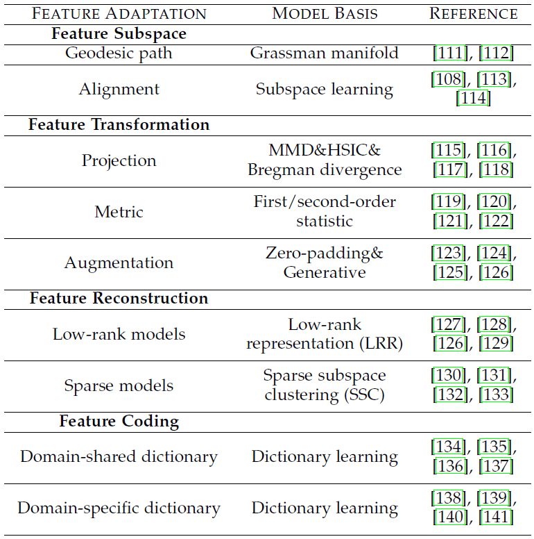 —Feature Adaptation。为了适应来自多个数据源的数据,通常需要学习投影源域和目标域分布相似的公共特征子空间或表示。