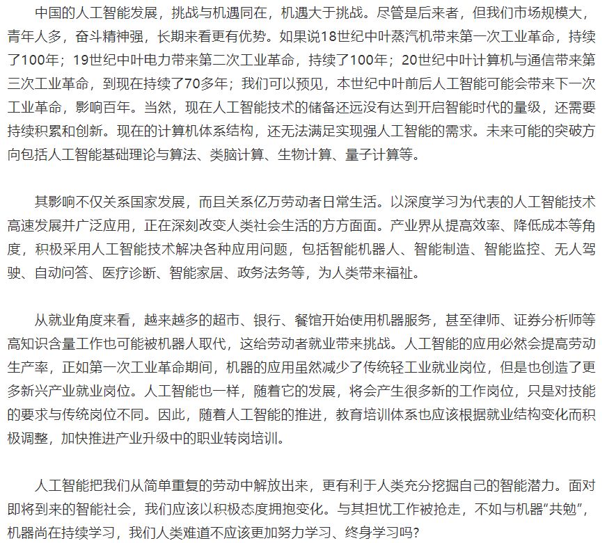 中国是世界上人工智能研发和产业规模最大的国家之一。虽然我们在人工智能基础理论与算法、核心芯片与元器件、机器学习算法开源框架等方面起步较晚,但在国家人工智能优先发展策略、大数据规模、人工智能应用场景与产业规模、青年人才数量等方面具有优势。