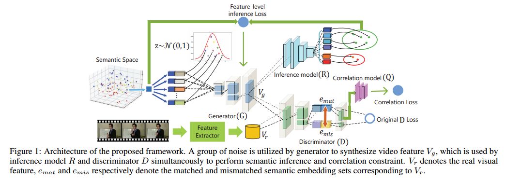 摘要:Zero-Shot Learning (ZSL) in video classification is a promising research direction, which aims to tackle the challenge from explosive growth of video categories. Most existing methods exploit seen-to-unseen correlation via learning a projection between visual and semantic spaces. However, such projection-based paradigms cannot fully utilize the discriminative information implied in data distribution, and commonly suffer from the information degradation issue caused by "heterogeneity gap". In this paper, we propose a visual data synthesis framework via GAN to address these problems. Specifically, both semantic knowledge and visual distribution are leveraged to synthesize video feature of unseen categories, and ZSL can be turned into typical supervised problem with the synthetic features. First, we propose multi-level semantic inference to boost video feature synthesis, which captures the discriminative information implied in joint visual-semantic distribution via feature-level and label-level semantic inference. Second, we propose Matching-aware Mutual Information Correlation to overcome information degradation issue, which captures seen-to-unseen correlation in matched and mismatched visual-semantic pairs by mutual information, providing the zero-shot synthesis procedure with robust guidance signals. Experimental results on four video datasets demonstrate that our approach can improve the zero-shot video classification performance significantly.