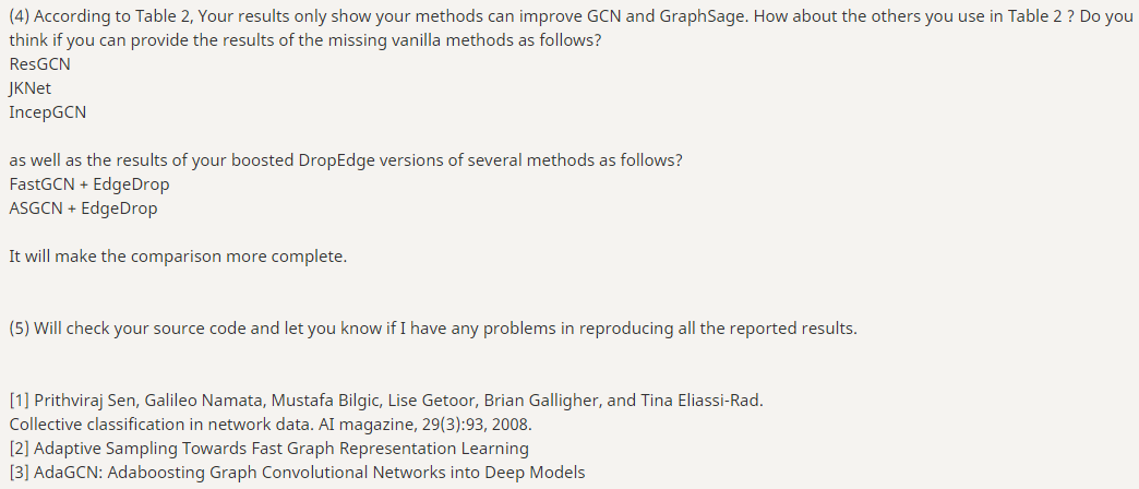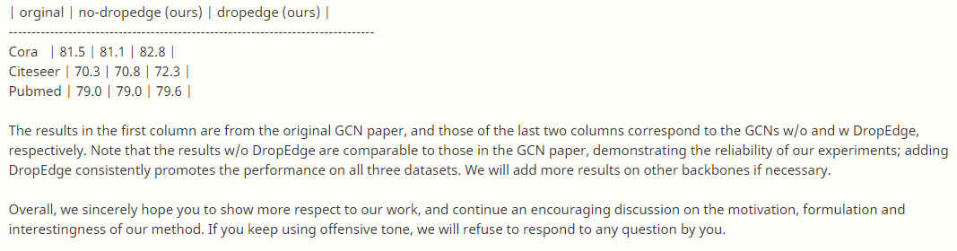 一篇关于GNN方向的提交论文DropEdge: Towards Deep Graph Convolutional Networks on Node Classification,其方法由于结果表现太好被广大网友质疑。一名叫 Alex Williams 的小哥 “放出狠话”,公开叫板,直怼作者团队。认为作者的方法带来的基本上都是伪提升,是改变了数据训练比例的“作弊”手段,对其他科研工作者不公平。作者团队也正面刚回去,并提供了源代码, Alex Williams 小哥继续说他要复现作者论文的结果,看看到底是否有问题。