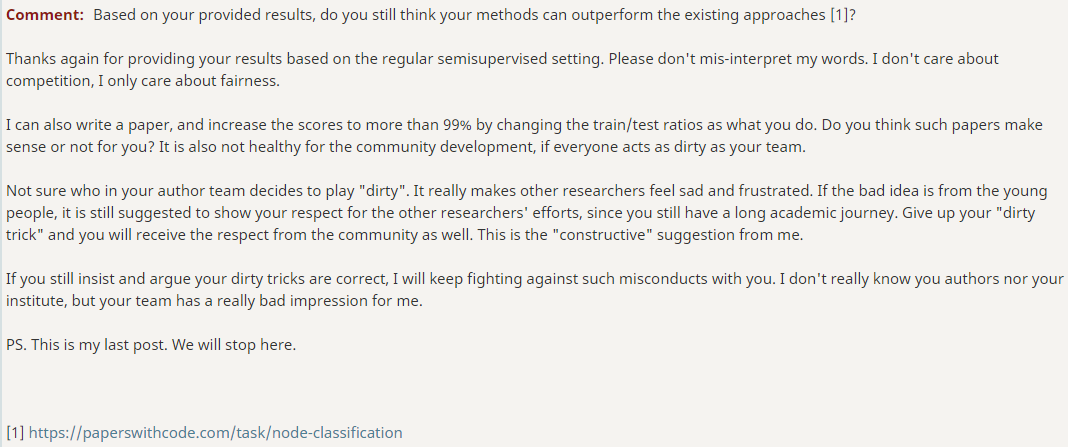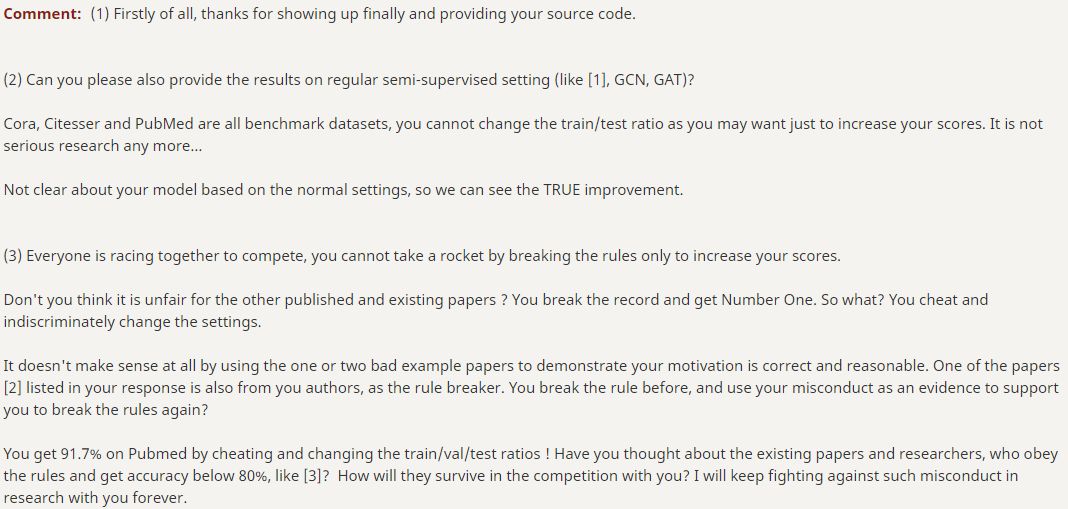 通过作弊和更改train/val/test比率,你们在Pubmed上获得了91.7%的分数! 你们有没有想过现有的论文和研究人员,他们遵守规则,正确率低于80%(就像[3])?,他们将如何在与你们的竞争中生存? 我将永远和他们一起与你们这种研究中的不端行为作斗争。