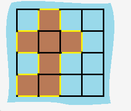 题目的意思是:有一个二维数组里面只有0和1,1表示土地,0表示水。土地被水环绕着,并且里面没有湖,也就是说1是连成一片的,里面没有0,让我们求土地的周长。