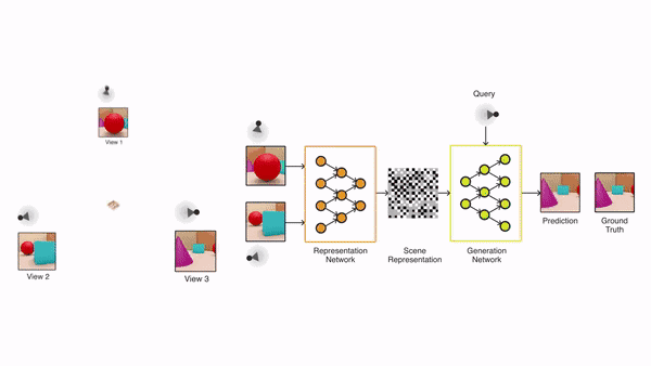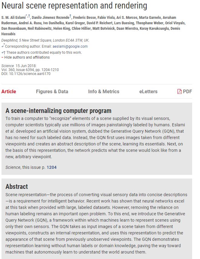 DeepMind的这套视觉系统,也即生成查询网络(GQN),使用从不同视角收集到的某个场景的图像,然后生成关于这个场景的抽象描述,通过一个无监督的表示学习过程,学习到了场景的本质。之后,在学到的这种表示的基础上,网络会预测从其他新的视角看这个场景将会是什么样子。这一过程非常类似人脑中对某个场景的想象。而理解一个场景中的视觉元素是典型的智能行为。