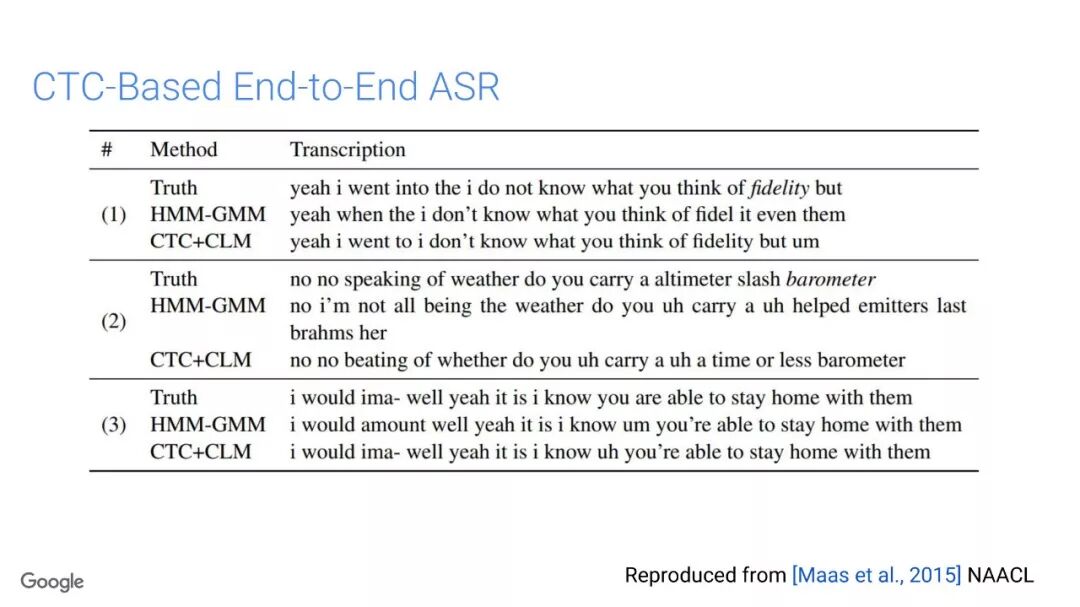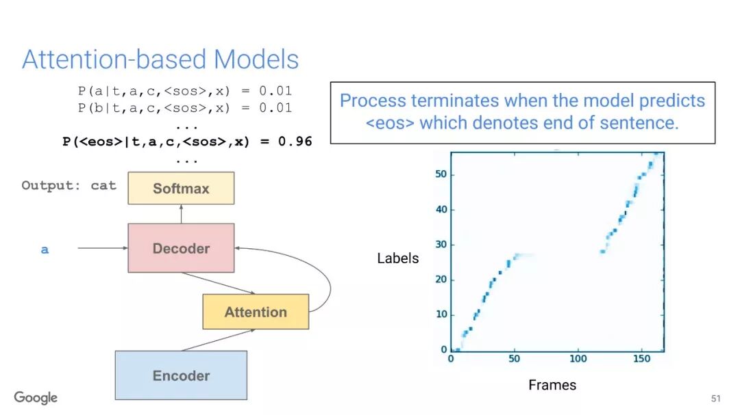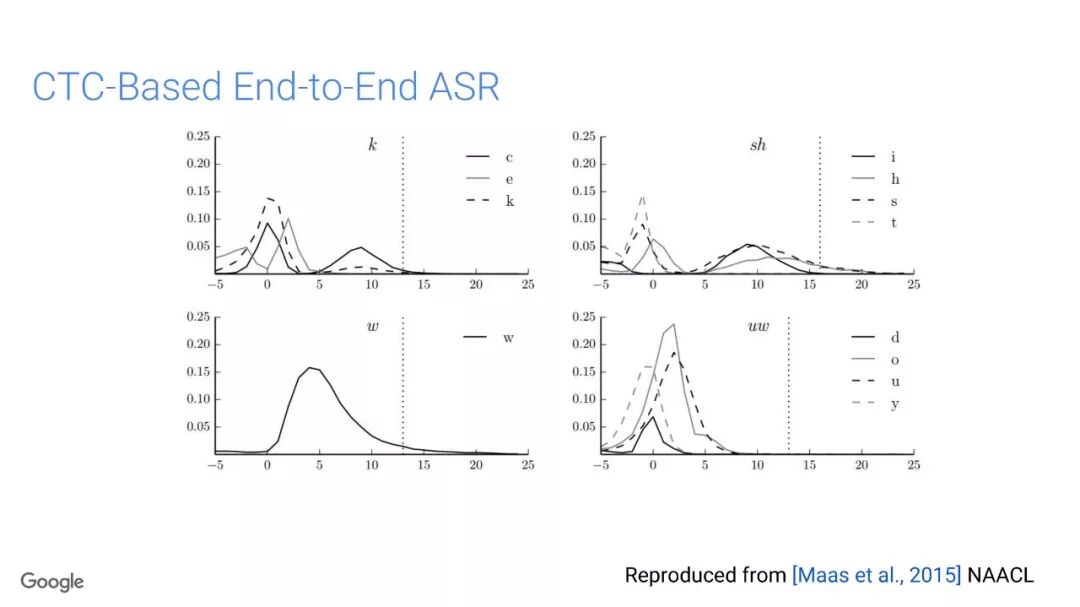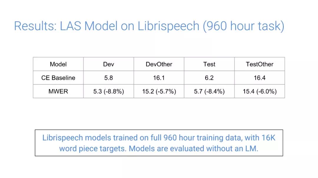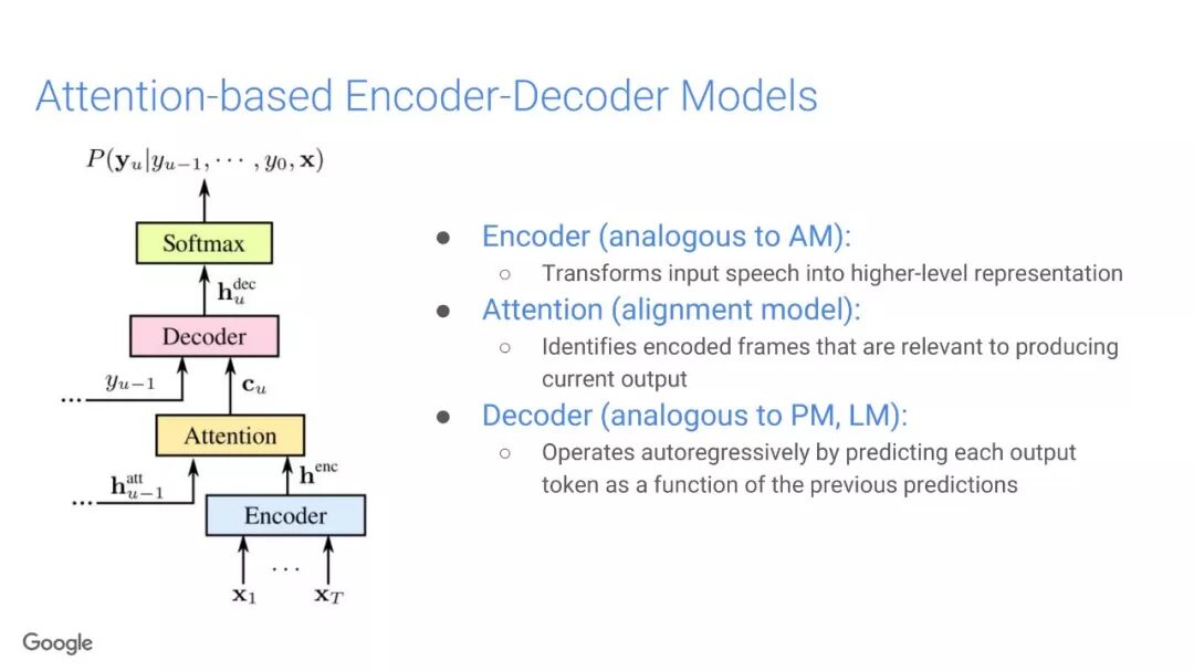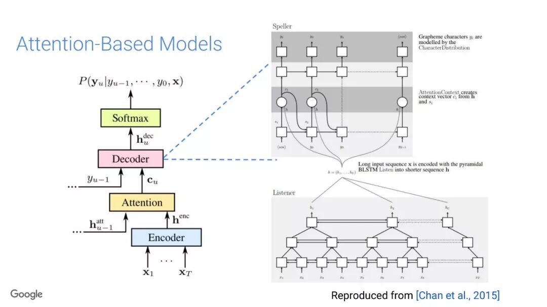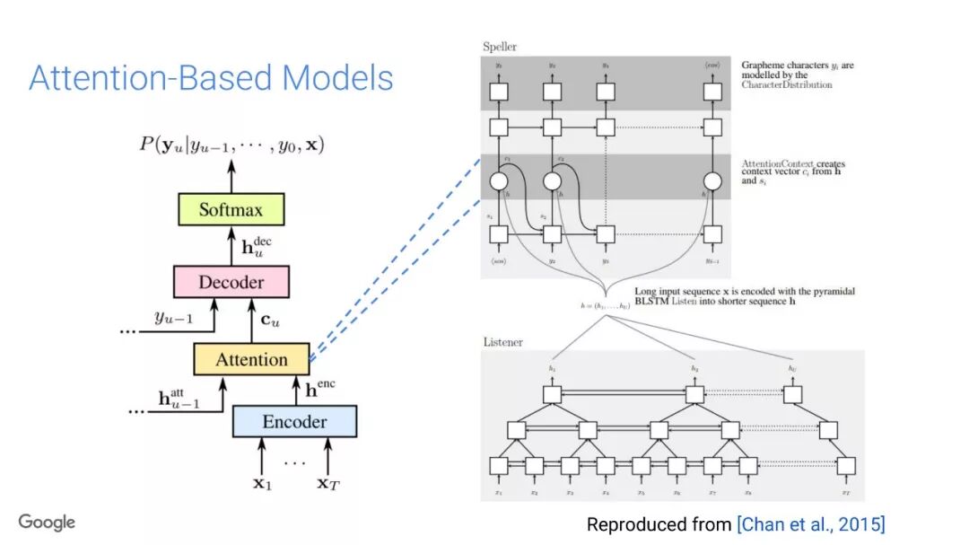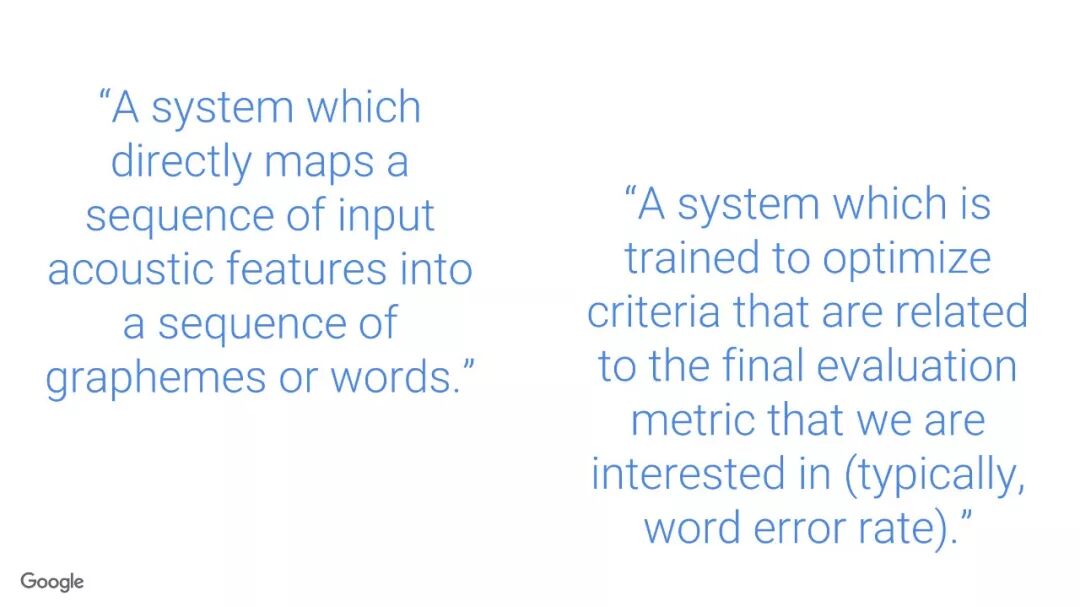 在传统的自动语音识别系统中,这些构件是在不同数据集上独立训练的,并且有一些独立的假设以方便处理。而在过去的几年里,人们对开发端到端的语音识别系统越来越感兴趣,这些系统试图在单个系统中完成多个构件的工作。例如基于attention的模型、循环神经传感器、循环神经校准器、目标词时序分类等。这些模型的共同特点在于,它们组成在一个单一的神经网络上,当接收一段语音信息后,直接输出一组图形或文字的概率分布。随着研究的逐渐深入,这种端到端的模型可以超过传统自动语音识别系统的性能。