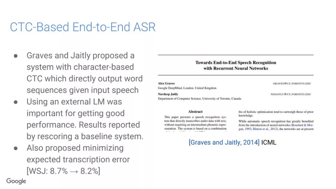 在本教程中,我们将详细介绍自动语音识别中的端到端建模方案,从这些系统的历史发展开始,同时分析这些方法的共性和区别;进而,我们将讨论一些最近的创新工作,这些创新极大地改进了端到端模型的性能,使它们能够超过传统的自动语音识别系统的性能;然后,本教程将描述这项研究的一些令人兴奋的应用,以及一些可能的研究方向;最终,我们将讨论端到端模型现在存在的问题,以及将来所面临的挑战。