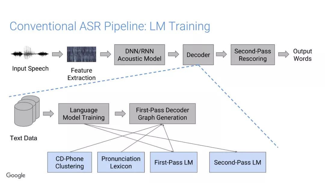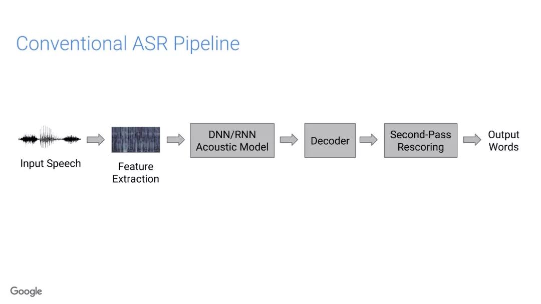 传统的语音识别系统是由一组独立的构件组成,即声学模型(AM)、语音模型(PM)、语言模型(LM)。其中AM输入以声学特征为主(通常是上下文相关的音素),以预测subword单元的分布;PM一般情况是人工设计的词典集合,它将声学模型产生的subword单元序列映射到单词上;最终,通过LM构件对各种词的概率进行计算,得到文本序列。