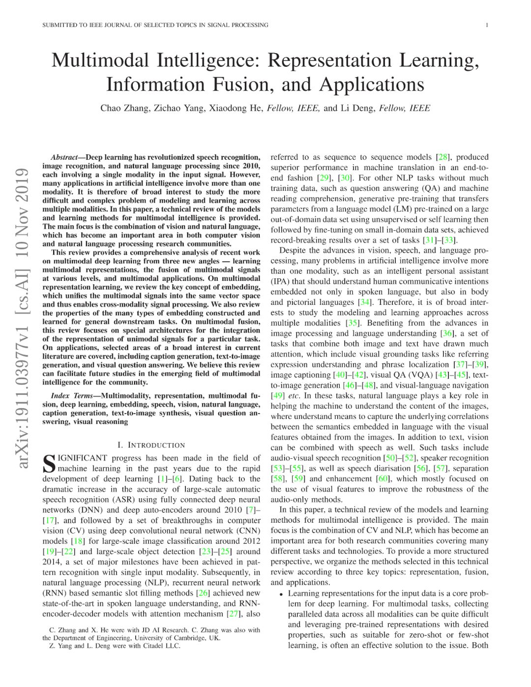 【导读】自从2010年以来,深度学习技术对语音,语言,视觉等子领域的推动,在语言和视觉跨模态交叉学科领域我们也取得了很多激动人心的进展,包括跨语言与图像的理解、推理和生成。多模态智能旨在融合多种模态的信息进行处理实现智能应用,在5G时代将会是重要的热点技术之一。最近IEEE Fellow何晓东和邓力等作者撰写关于多模态智能的综述论文《Multimodal Intelligence: Representation Learning, Information Fusion, and Applications》,详述了多模态智能研究进展,涵盖259篇参考文献,本文从学习多模态表示、多模态信号在不同层次上的融合以及多模态应用三个新角度对多模态深度学习的最新研究成果进行了综合分析。