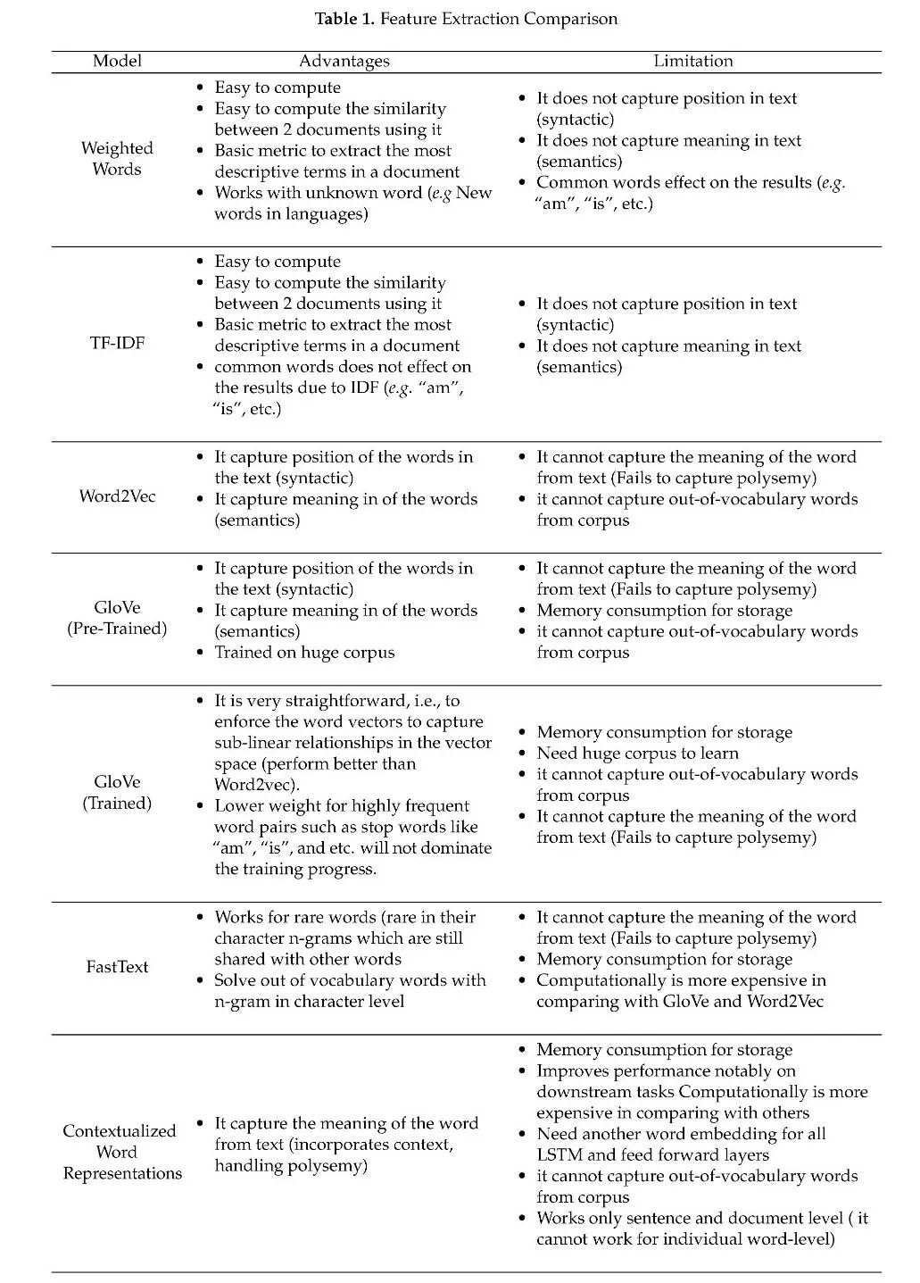 1. 特征提取:一般来说,文本和文档都是非结构化数据集。然而,当使用数学建模作为分类器的一部分时,这些非结构化文本序列必须转换到结构化的特征空间。首先,需要清除数据,以省略不必要的字符和单词。在数据被清除之后,可以使用形式化的特征提取方法。常用的特征提取技术有词频逆文档频率(TF- idf)、词频、Word2Vec和用于单词表示的全局向量(GloVe)。在第2节中,我们将这些方法分为单词嵌入技术和加权单词技术,并讨论了技术实现细节。