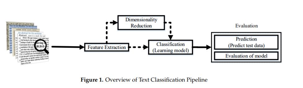 4. 评价方法:文本分类管道的最后一部分是评估。理解模型如何执行对于文本分类方法的使用和开发至关重要。评价监督技术的方法有很多。精度计算是最简单的评估方法,但不适用于不平衡数据集。在第五节中,我们概述以下评价方法用于文本分类算法:Fβ分数,马修斯相关系数(MCC)[30],接收机工作特性(ROC),和ROC曲线下面积(AUC) 。
