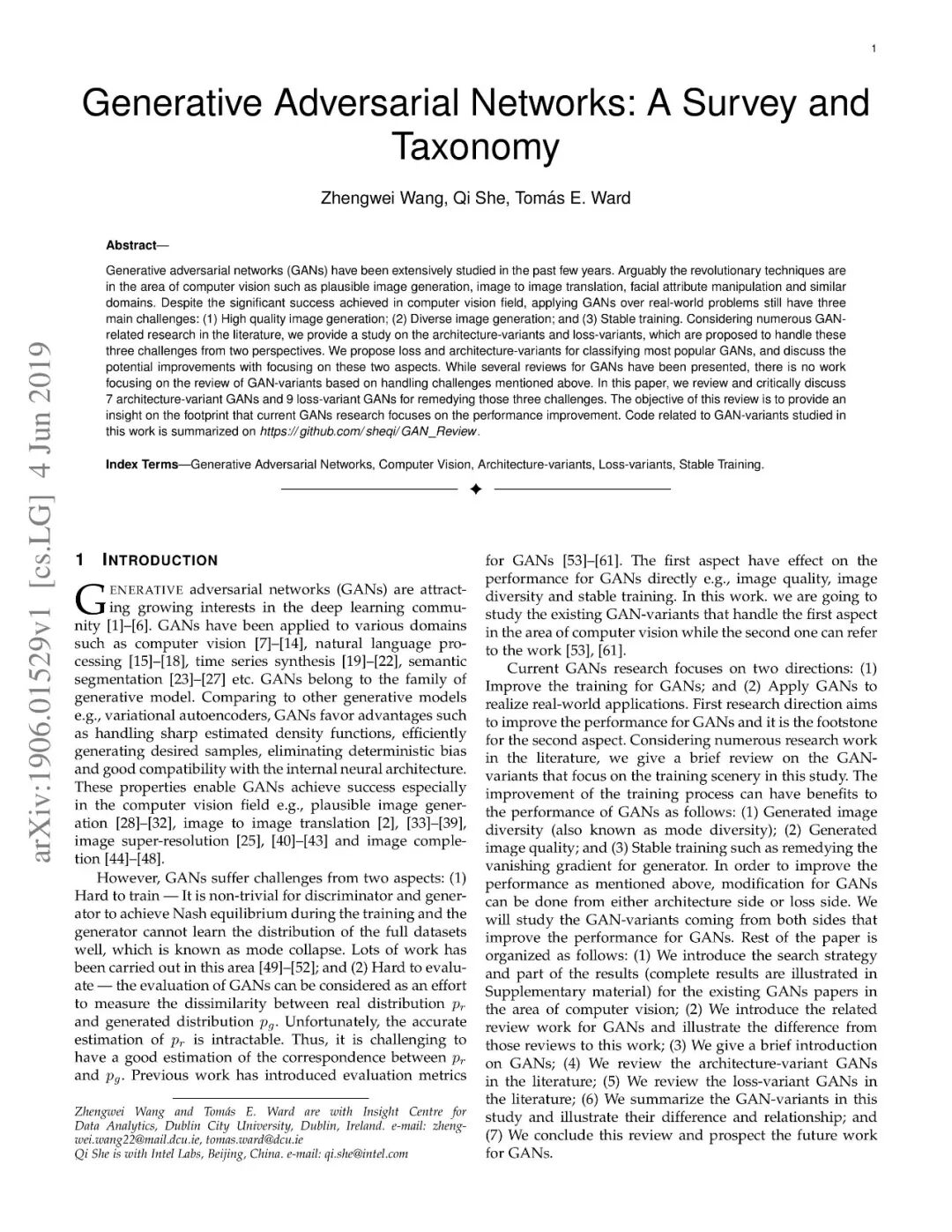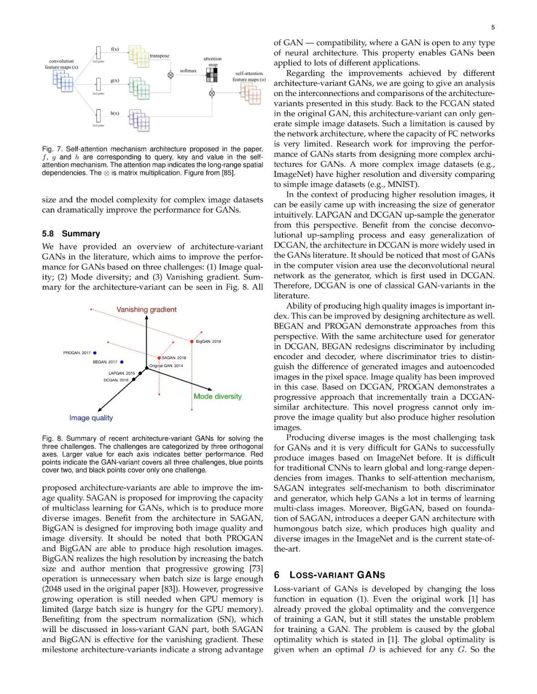 近些年来,生成式对抗网络(GANs)在机器学习领域,得到了广泛的研究,可以说是计算机领域革命性的技术成果,具有广泛的应用价值(如图像生成、图像转换、面部属性操作等)。尽管在计算机视觉领域得到了显著成功,但将GAN应用于实际问题,仍然存在着三个主要挑战:(1)高质量图像生成;(2)多样化的图像生成;(3)稳定的训练效果。考虑到文献中的大量GAN相关研究,我们提供了一个此方向的研究系统分类,从两个方向来论述了以上三个挑战。在本文中,我们回顾了7中架构及8中损失函数,并进行了相关性能分析。