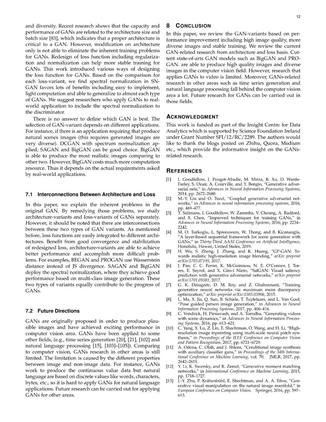 生成式对抗网络研究主要关注于两个方向:(1)提升GAN的训练效果;(2)将GAN应用于现实应用。第一个研究方向旨在提高GAN的模型性能,通过文中多种研究工作,我们提供了一份简短的介绍,来描述GAN以及其变体的相关进展其对性能的提升可以被总结为几个方面:(1)生成图像的多样性;(2)生成图像的质量;(3)稳定的训练过程。为了达到以上的提升效果,我们需要从两个方向进行改变:模型架构与loss函数。本文将从两个方向着手,分别对GAN家族中的相关模型进行系统分类。